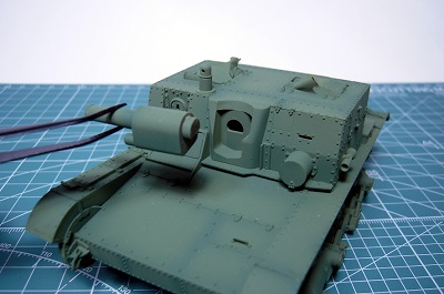 組み立てるうえでの問題点はそれほどなく、数日で形になるだろう。 パーツを光にかざすと裏側が透けて見えるほど薄いので切り出しは慎重に行いたい。 戦闘室が完全な箱組でパーツが薄いために接着面積も狭く隙間や歪みが生じやすいので気を付けよう。 ピン接着による可動履帯がついていて根気があれば誰でも簡単に履帯の弛みを再現できる。。 ピンッと張ったロリッ娘仕様?だるんだるんのBBA仕様? 何枚使うかは組説には書いてないので自分好みで調節しよう。 唯一にして最大の不満点と疑問点が「砲が可動しない」! 戦闘室前面に直接接着するという実にソ連らしさを表現した大胆設計。 これにより砲身の向きによる戦車の表情を出すことが出来ないため組み上げても湧き上がる感情は薄い。 改造しようにもたぶん結構手間がかかりそうだが、そこに挑戦するのもいいかもしんない。