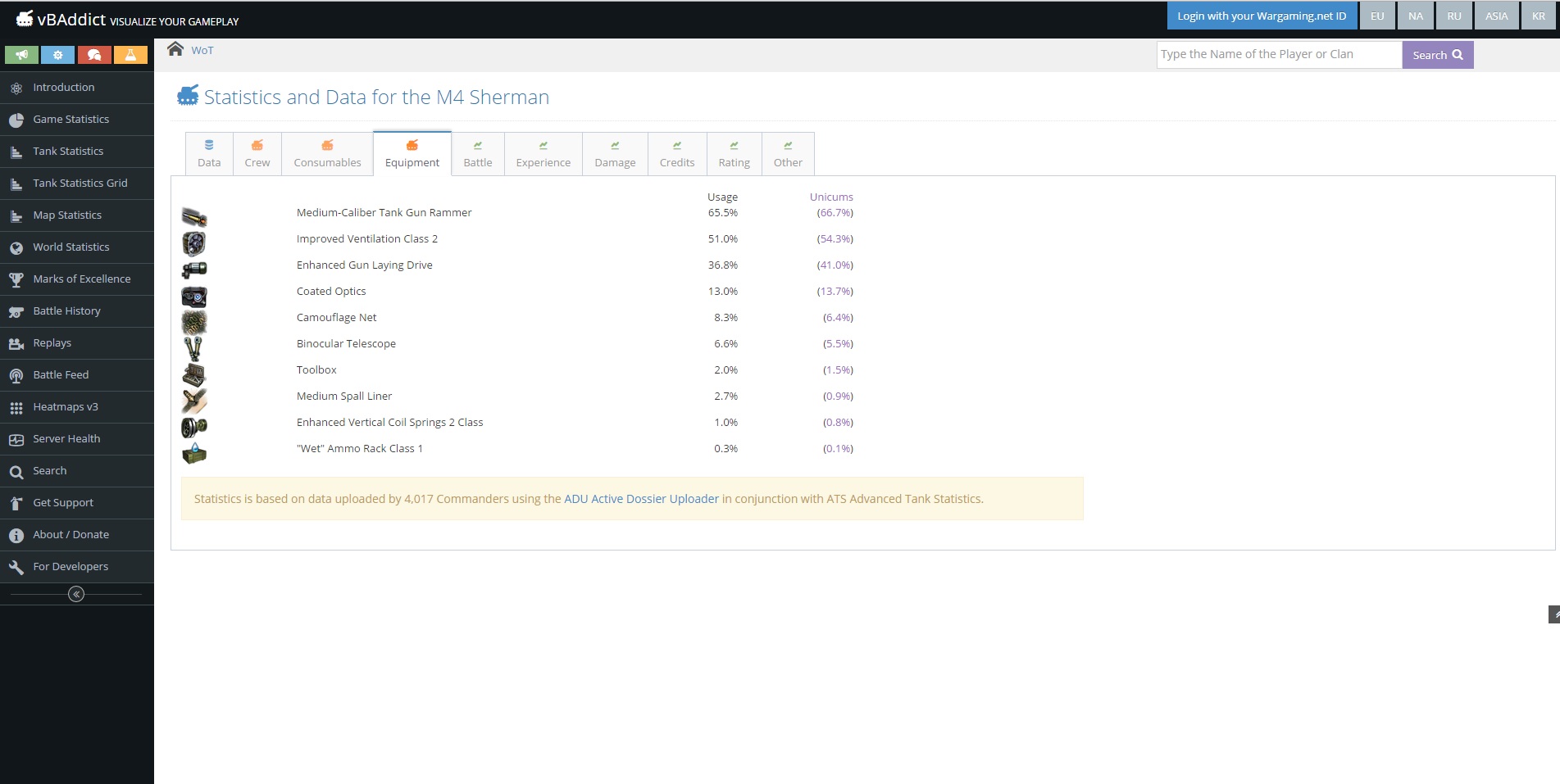 今回はTier5MT M4シャーマンの統計データを確認してみよう Equipmentのタブを選択すればこのようにどのような拡張パーツをが人気か一目瞭然 Usageが全体での使用率で、紫の数字はユニカムと呼ばれるトッププレイヤー達の使用率 Consumablesをクリックすれば消耗品の統計が、Skillsをクリックすればセカンダリスキルの統計が表示される