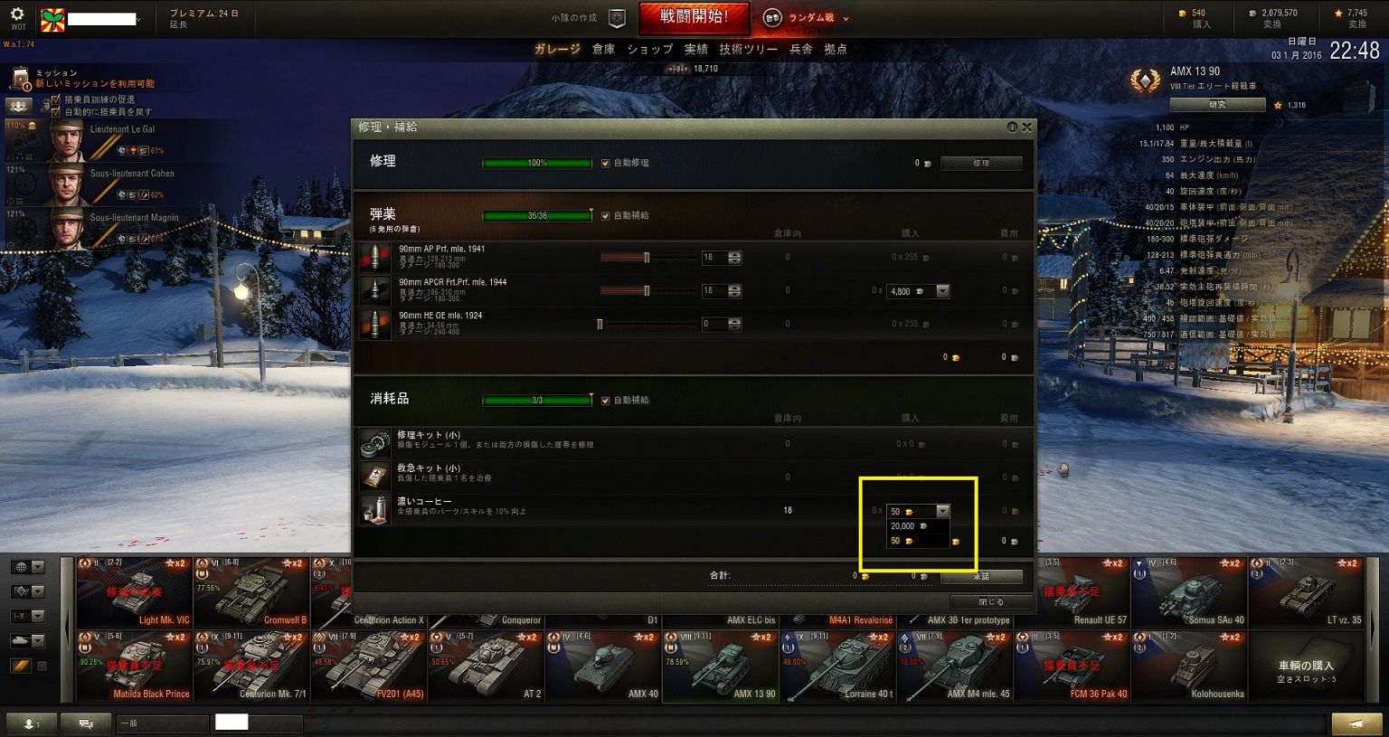 油類 色々種類があるガソリンだったりオイル 5000クレジットで購入可能(105オクタンガソリンだけ20000クレジットもしくは50ゴールド) エンジン出力が向上するのでようは機動性が向上する 当たり前だがガソリンはディーゼルエンジン搭載車には使用不可 実はガソリンのみ砲塔旋回も向上する 主に軽戦車で爆走したい人向け